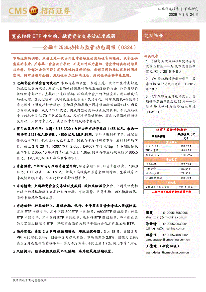 招商证券-金融市场流动性与监管动态周报:宽基指数ETF净申购,融资资金交易活跃度减弱-260324