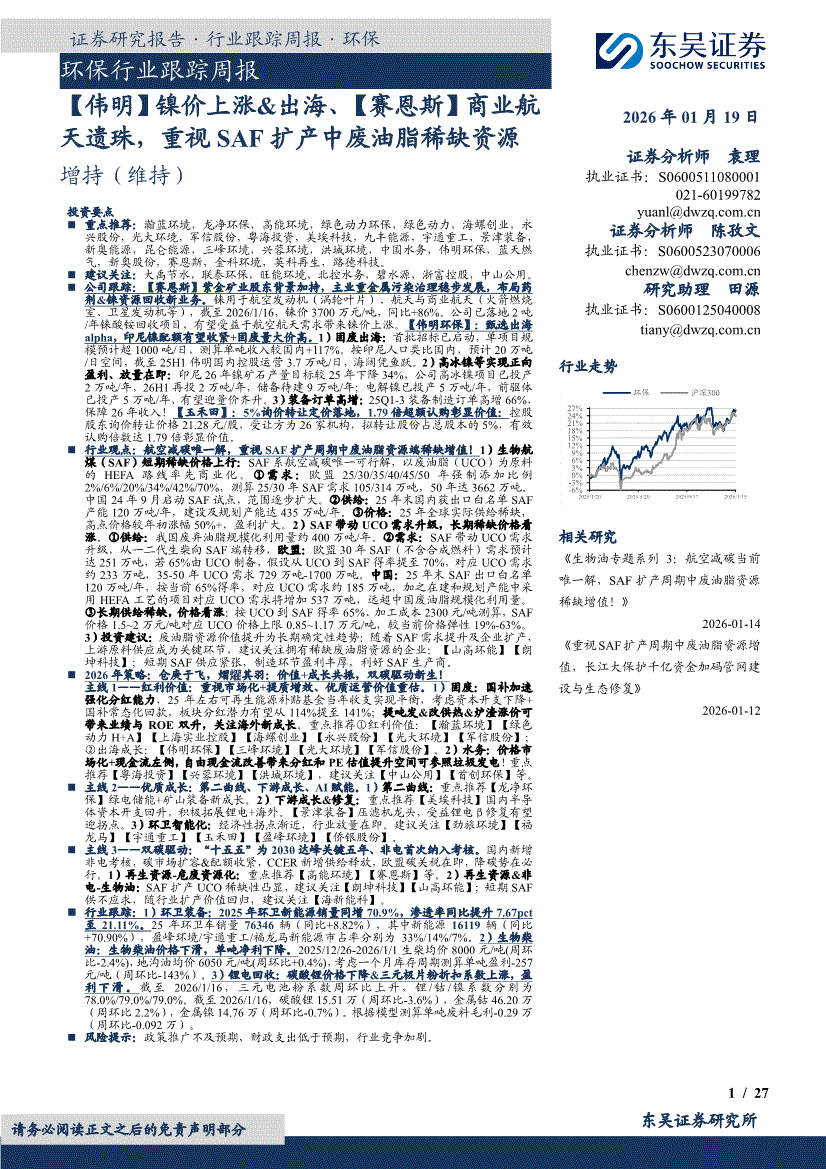 环保行业:东吴证券-环保行业跟踪周报:【伟明】镍价上涨&出海、【赛恩斯】商业航天遗珠,重视SAF扩产中废油脂稀缺资源-260119