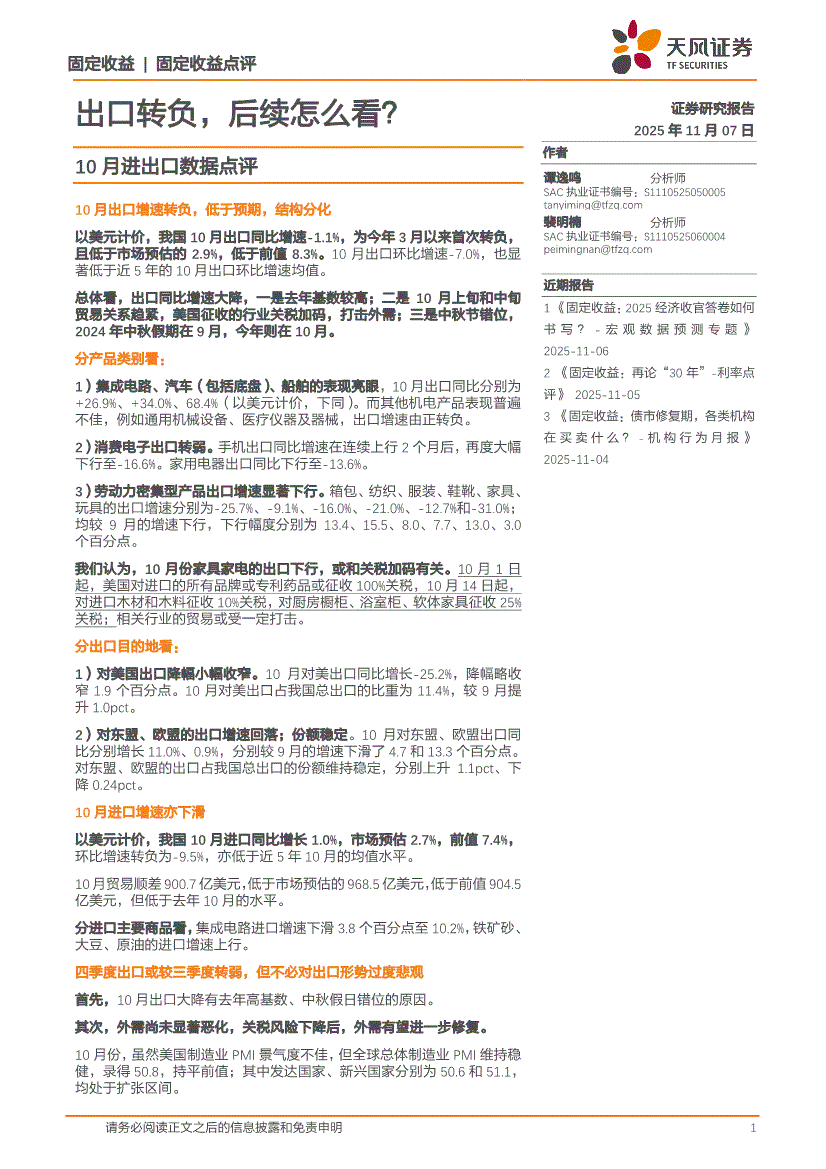 天风证券-10月进出口数据点评:出口转负,后续怎么看?-251107