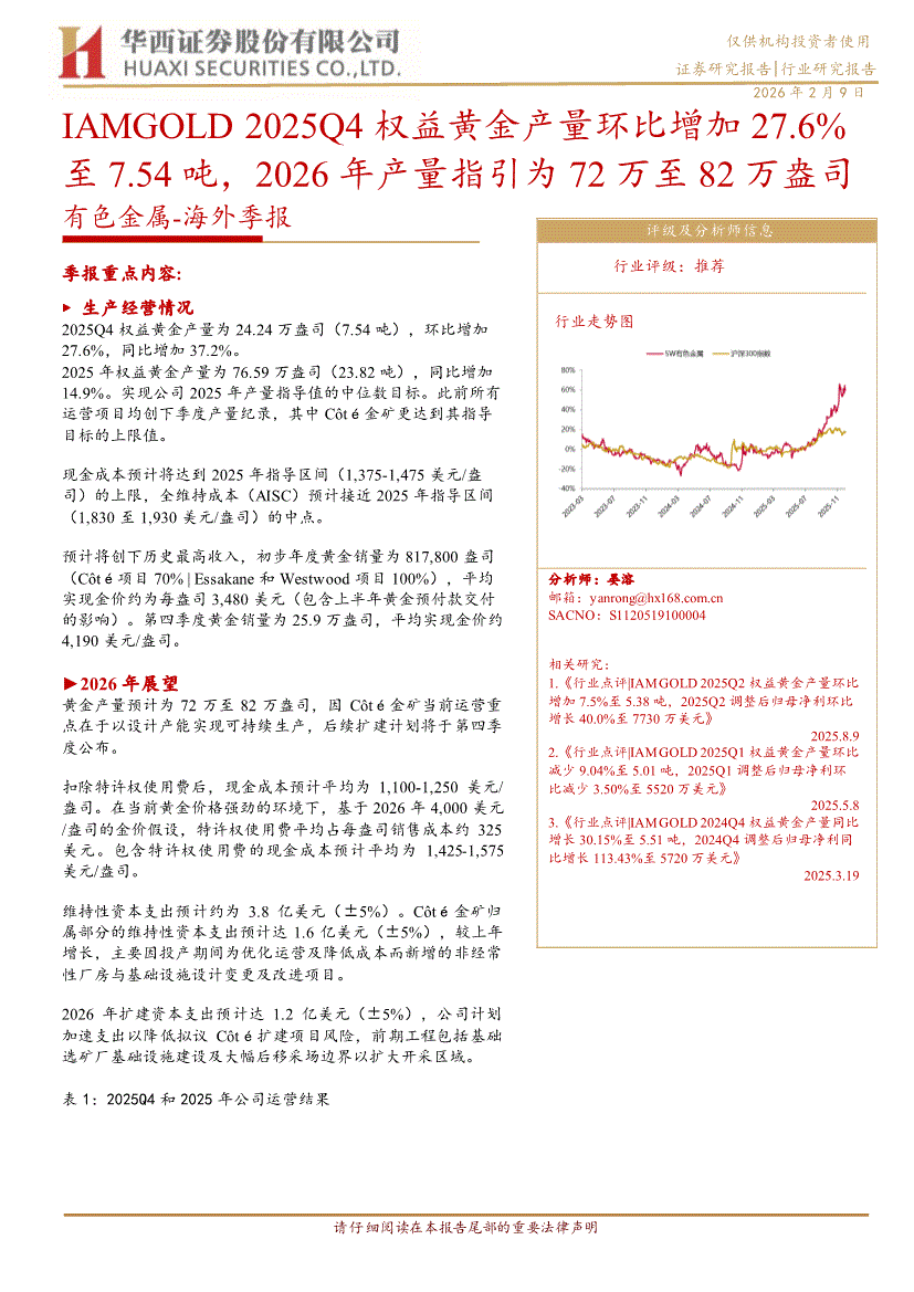 有色金属行业:华西证券-有色金属行业~海外季报:IAMGOLD 2025Q4权益黄金产量环比增加27.6%至7.54吨,2026年产量指引为72万至82万盎司-260209