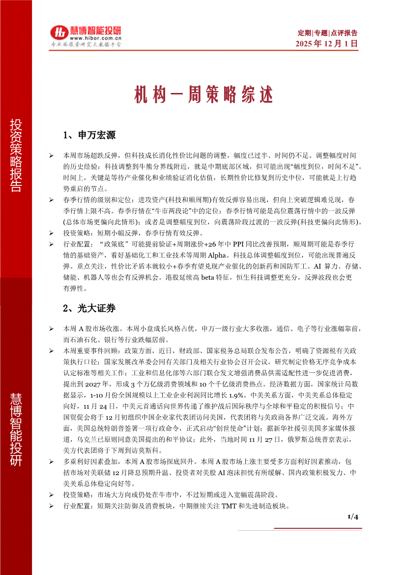 慧博智能投研-机构周策略:机构观点及行业配置-251130
