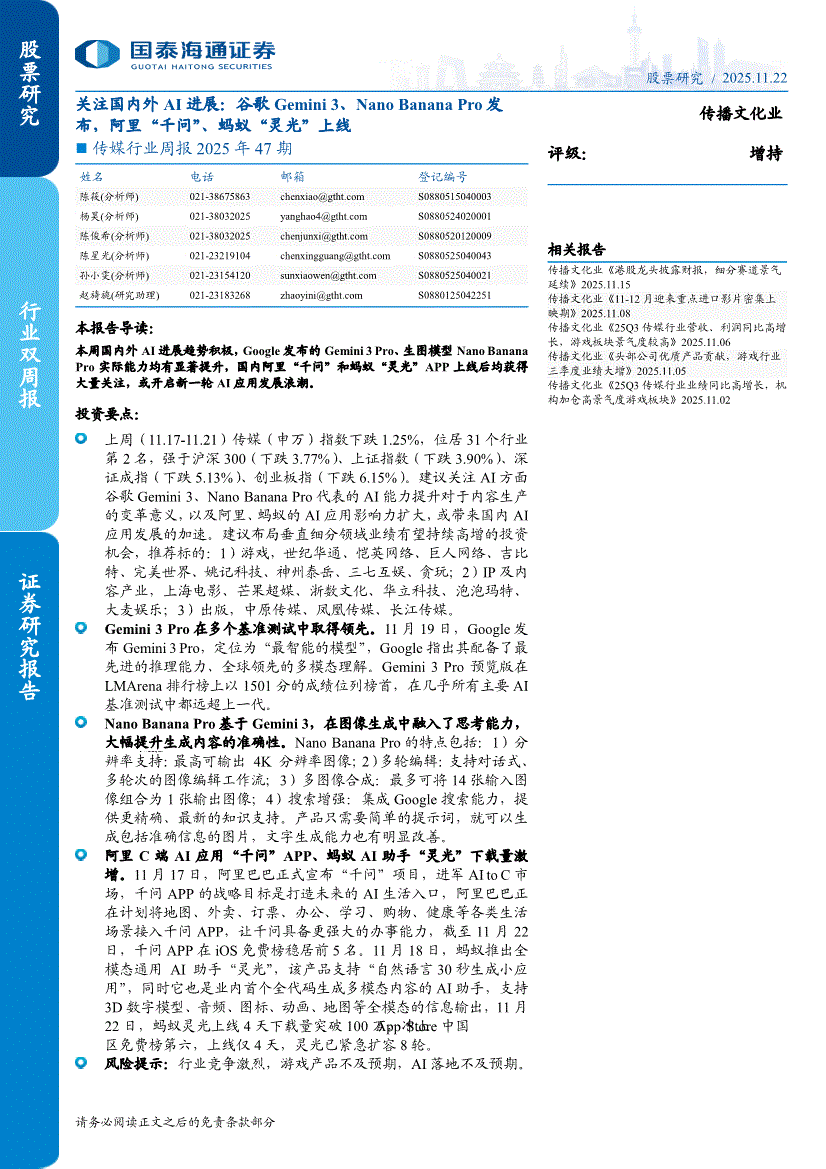 国泰海通证券-传媒行业周报2025年47期:关注国内外AI进展,谷歌Gemini 3、Nano Banana Pro发布,阿里“千问”、蚂蚁“灵光”上线-251122