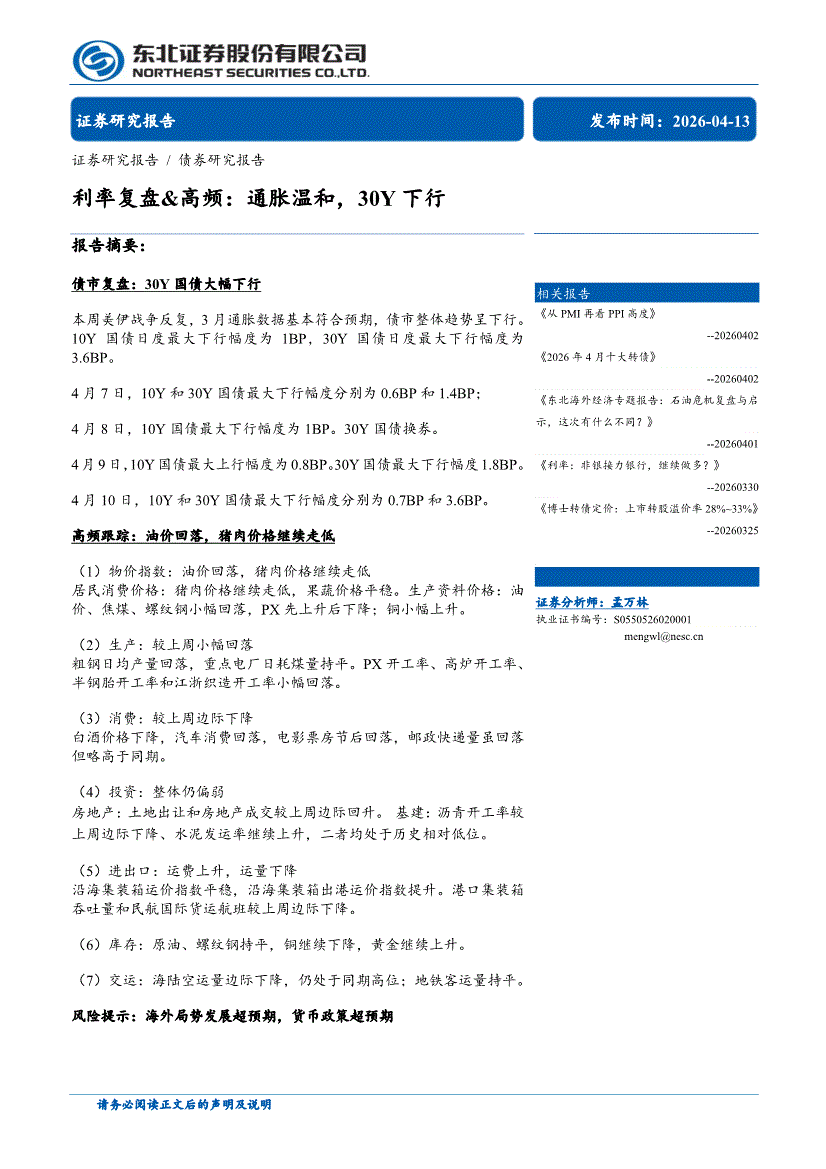 东北证券-利率复盘&高频:通胀温和,30Y下行-260413
