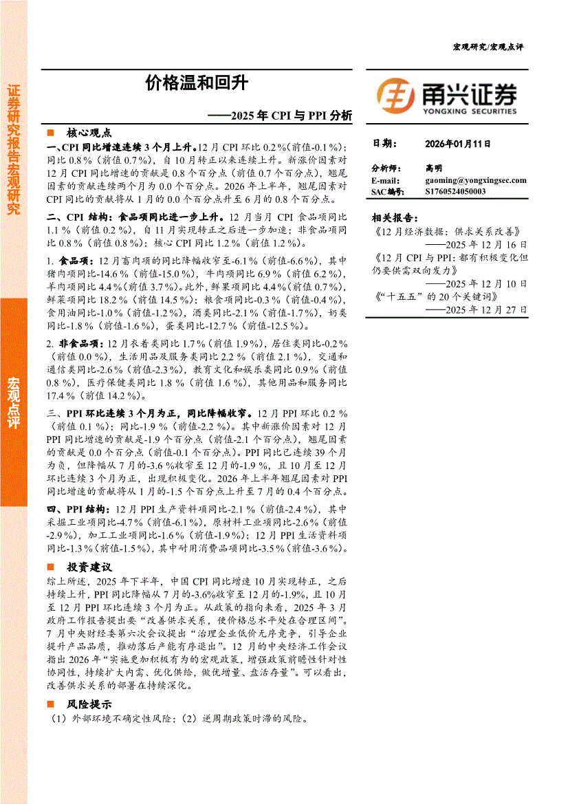 甬兴证券-2025年CPI与PPI分析:价格温和回升-260111