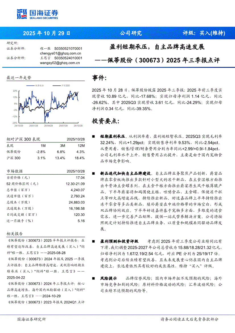 佩蒂股份:国海证券-佩蒂股份-300673-2025年三季报点评:盈利短期承压,自主品牌高速发展-251029