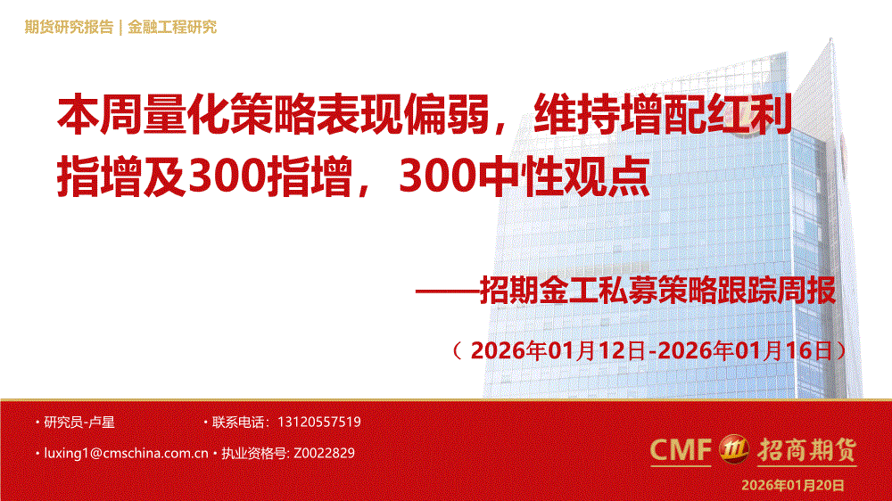 招商期货-金工私募策略跟踪周报:本周量化策略表现偏弱,维持增配红利指增及300指增,300中性观点-260120
