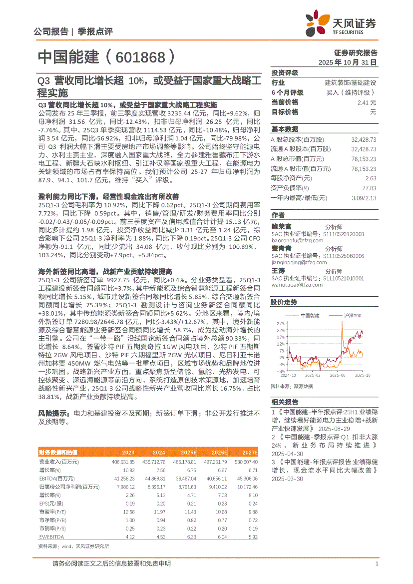 中国能建:天风证券-中国能建-601868-Q3营收同比增长超10%,或受益于国家重大战略工程实施-251031