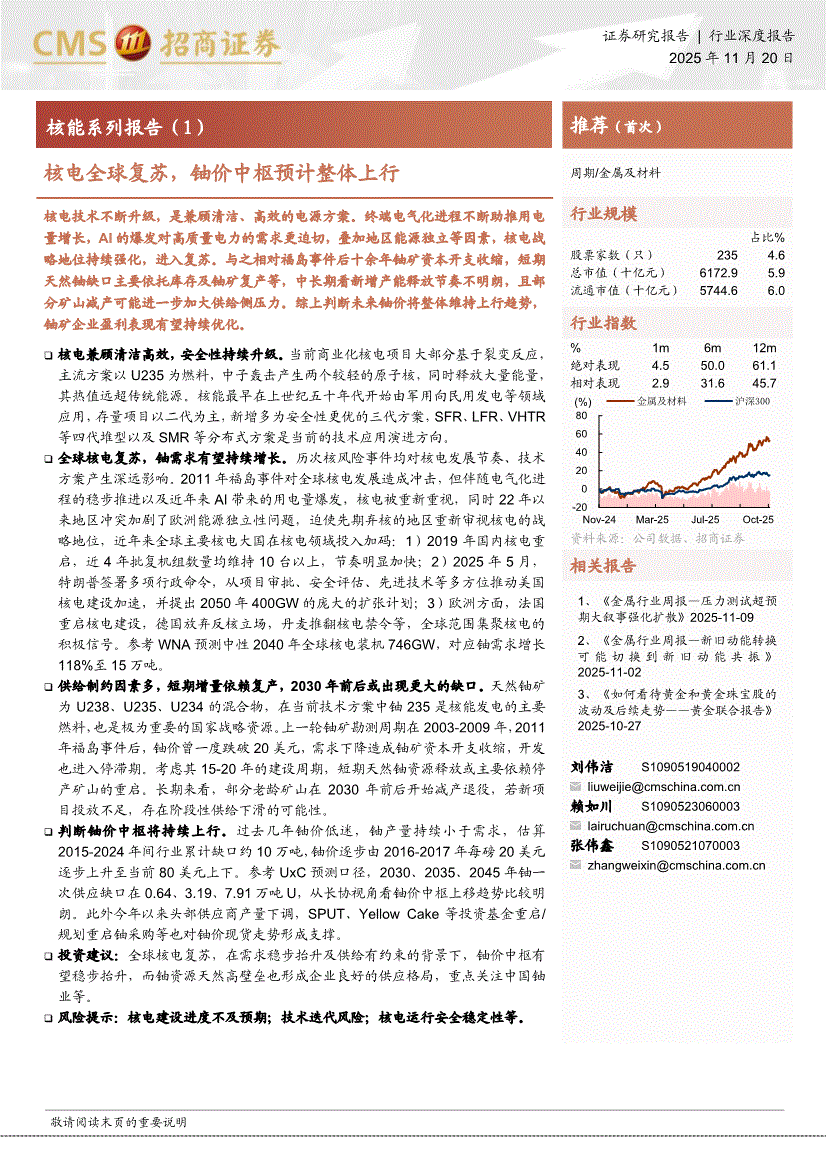金属及材料行业:招商证券-金属及材料行业核能系列报告(1):核电全球复苏,铀价中枢预计整体上行-251120