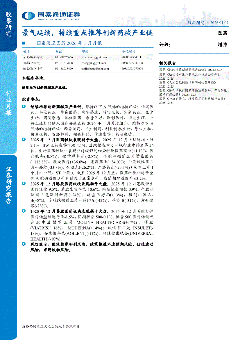医药行业:国泰海通证券-医药行业2026年1月月报:景气延续,持续重点推荐创新药械产业链-260104