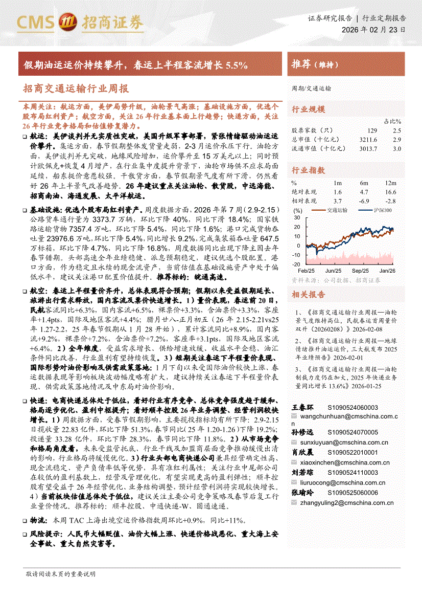 交通运输行业:招商证券-招商交通运输行业周报:假期油运运价持续攀升,春运上半程客流增长5.5%-260223