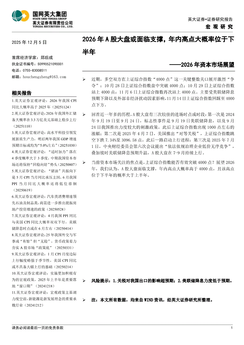 英大证券-2026年资本市场展望:2026年A股大盘或面临支撑,年内高点大概率位于下半年-251205