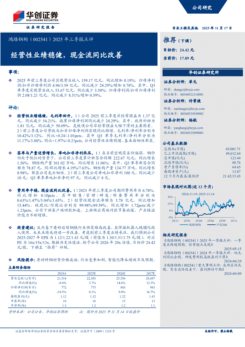 鸿路钢构:华创证券-鸿路钢构-002541-2025年三季报点评:经营性业绩稳健,现金流同比改善-251117