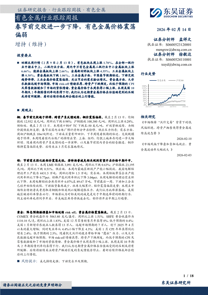 有色金属行业:东吴证券-有色金属行业跟踪周报:春节前交投进一步下降,有色金属价格震荡偏弱-260214