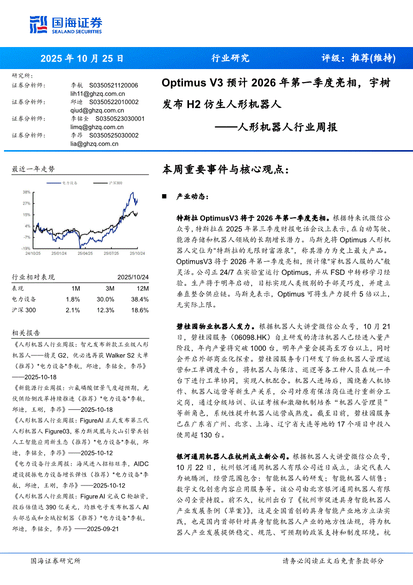 人形机器人行业:国海证券-人形机器人行业周报:Optimus V3预计2026年第一季度亮相,宇树发布H2仿生人形机器人-251025