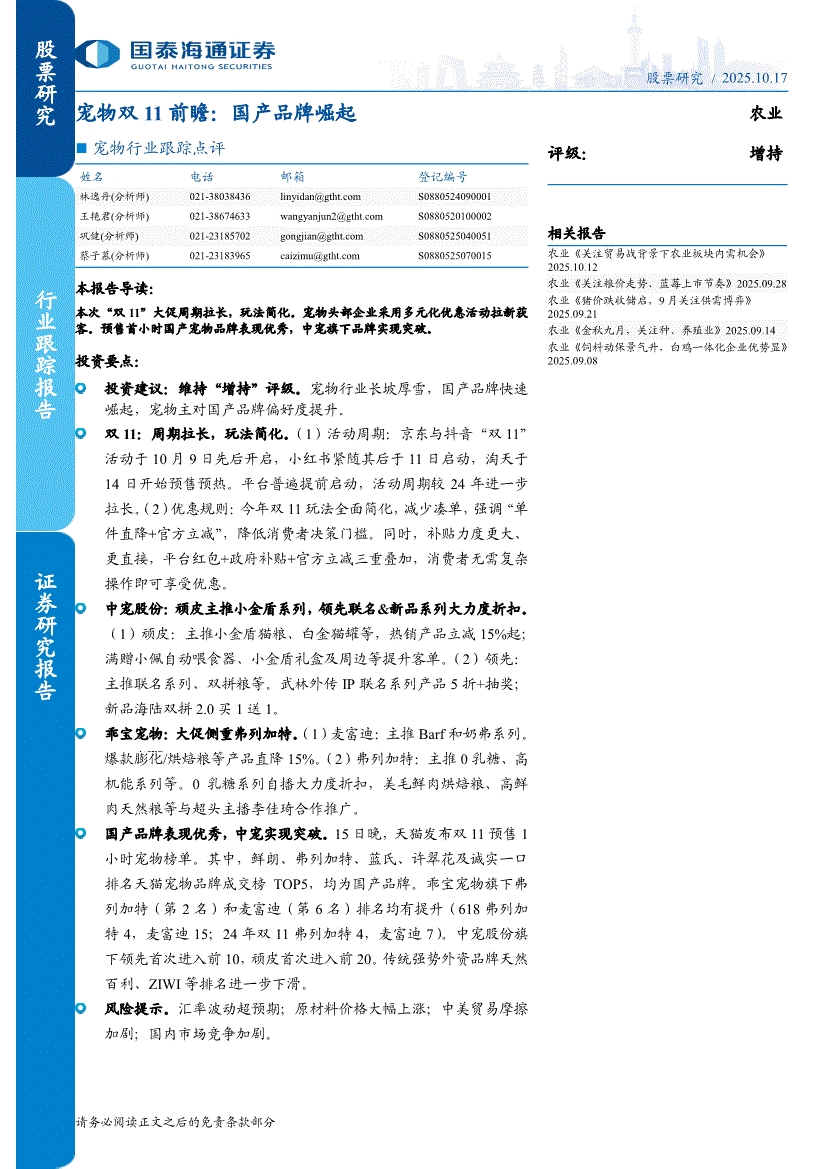 宠物行业:国泰海通证券-宠物行业跟踪点评:宠物双11前瞻,国产品牌崛起-251017