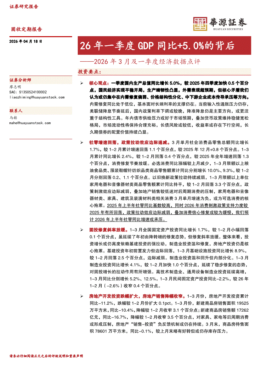 华源证券-2026年3月及一季度经济数据点评:26年一季度GDP同比+5.0%的背后-260418