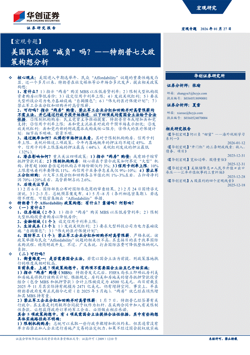 华创证券-【宏观专题】美国民众能“减负”吗?——特朗普七大政策构想分析-260127