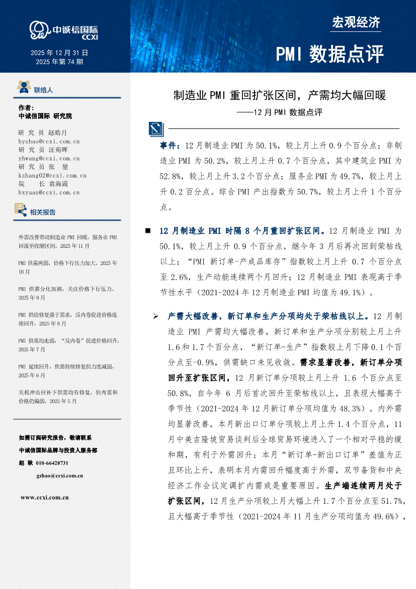 中诚信国际-12月PMI数据点评:制造业PMI重回扩张区间,产需均大幅回暖-251231