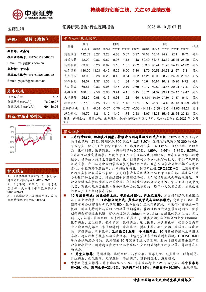 中泰证券-医药生物行业:持续看好创新主线,关注Q3业绩改善-251007