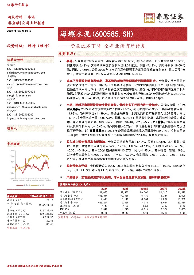 海螺水泥:华源证券-海螺水泥-600585-受益成本下降,全年业绩有所修复-260401