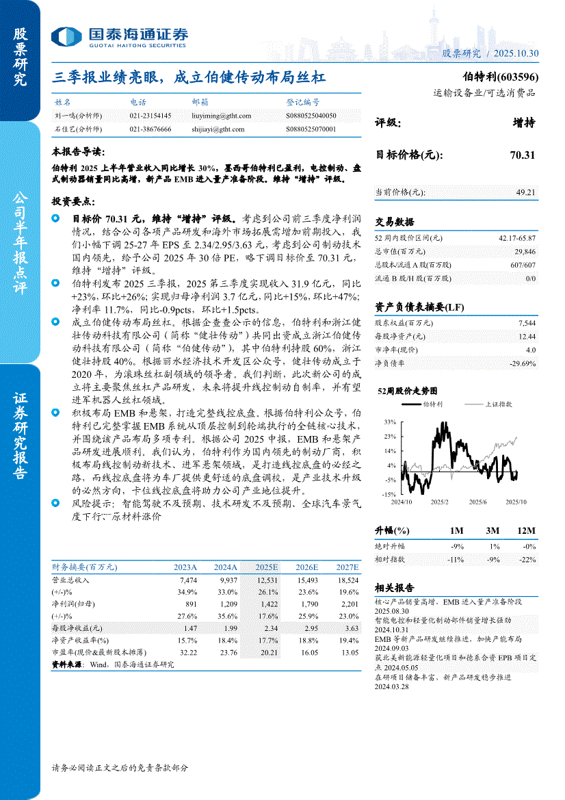 伯特利:国泰海通证券-伯特利-603596-三季报业绩亮眼,成立伯健传动布局丝杠-251030