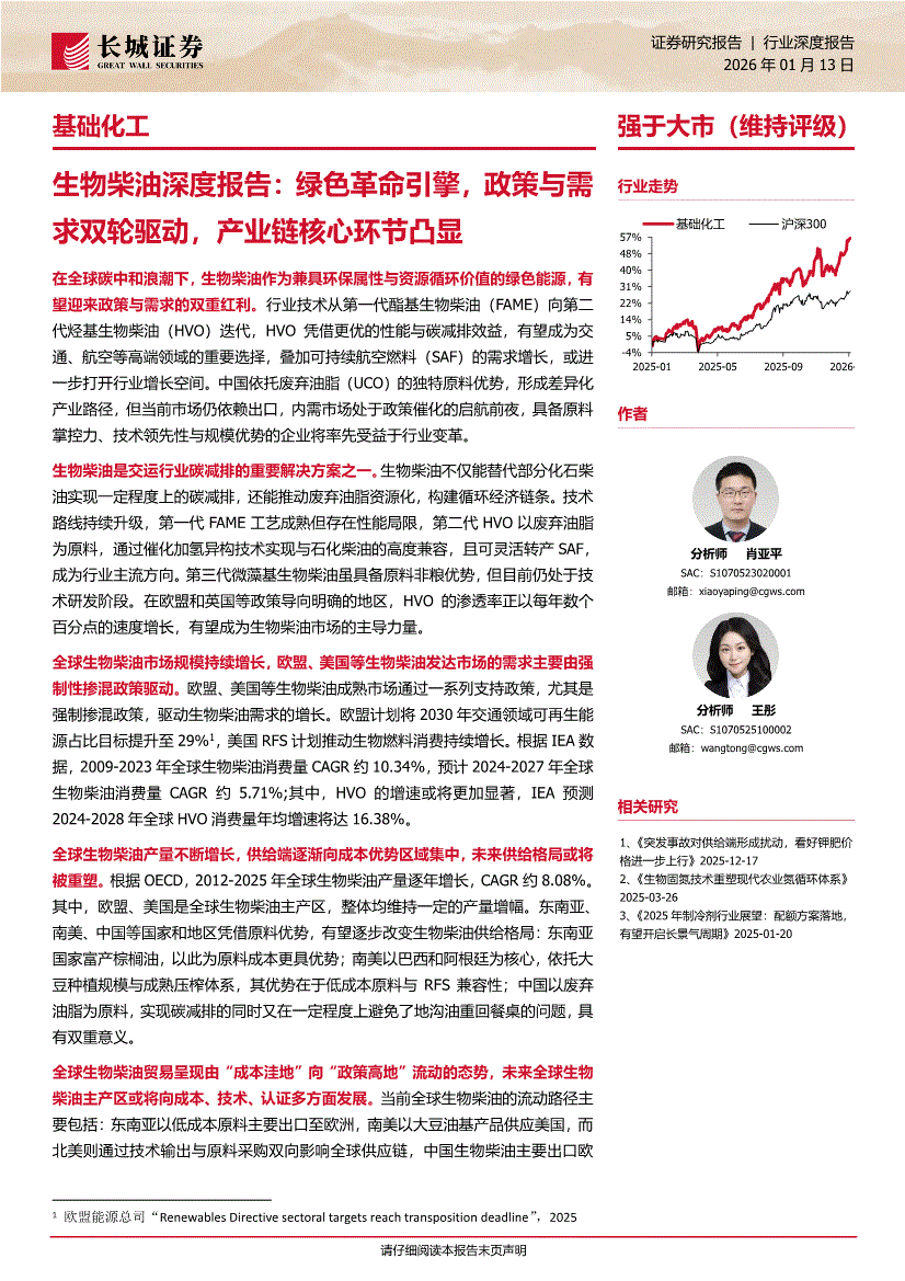 基础化工行业:长城证券-基础化工行业生物柴油深度报告:绿色革命引擎,政策与需求双轮驱动,产业链核心环节凸显-260113