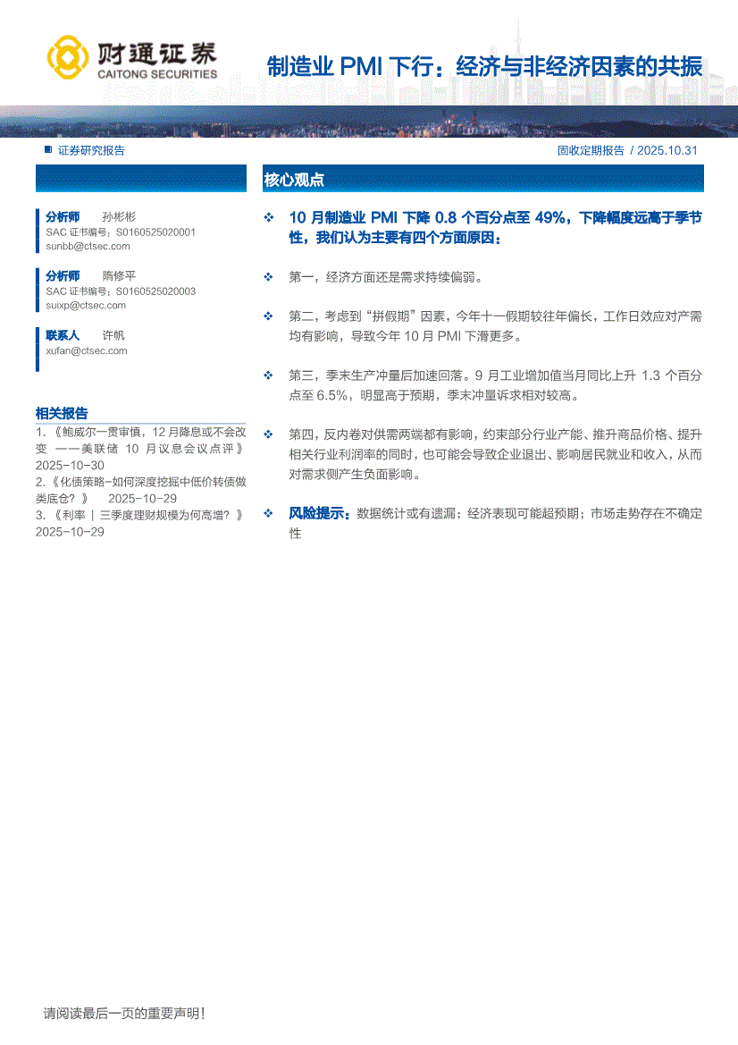 财通证券-制造业PMI下行:经济与非经济因素的共振-251031