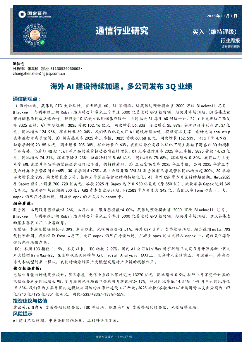 通信行业:国金证券-通信行业周报:海外AI建设持续加速,多公司发布3Q业绩-251101