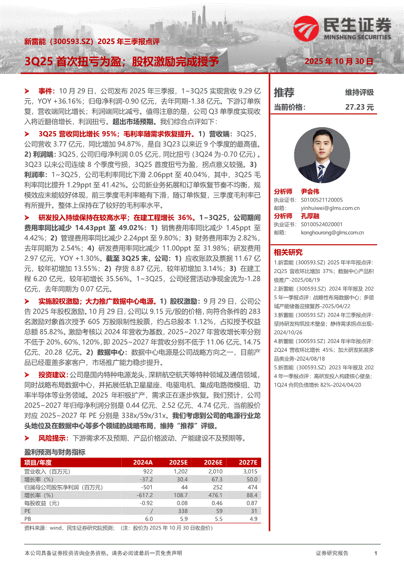 新雷能:民生证券-新雷能-300593-2025年三季报点评:3Q25首次扭亏为盈;股权激励完成授予-251030
