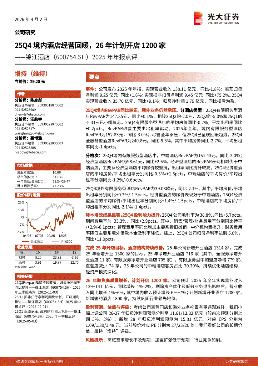 锦江酒店:光大证券-锦江酒店-600754-2025年年报点评:25Q4境内酒店经营回暖,26年计划开店1200家-260402