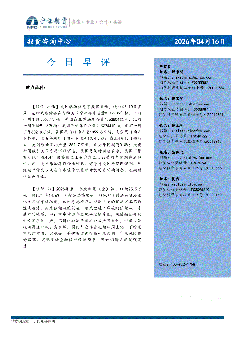 宁证期货-今日早评-260416
