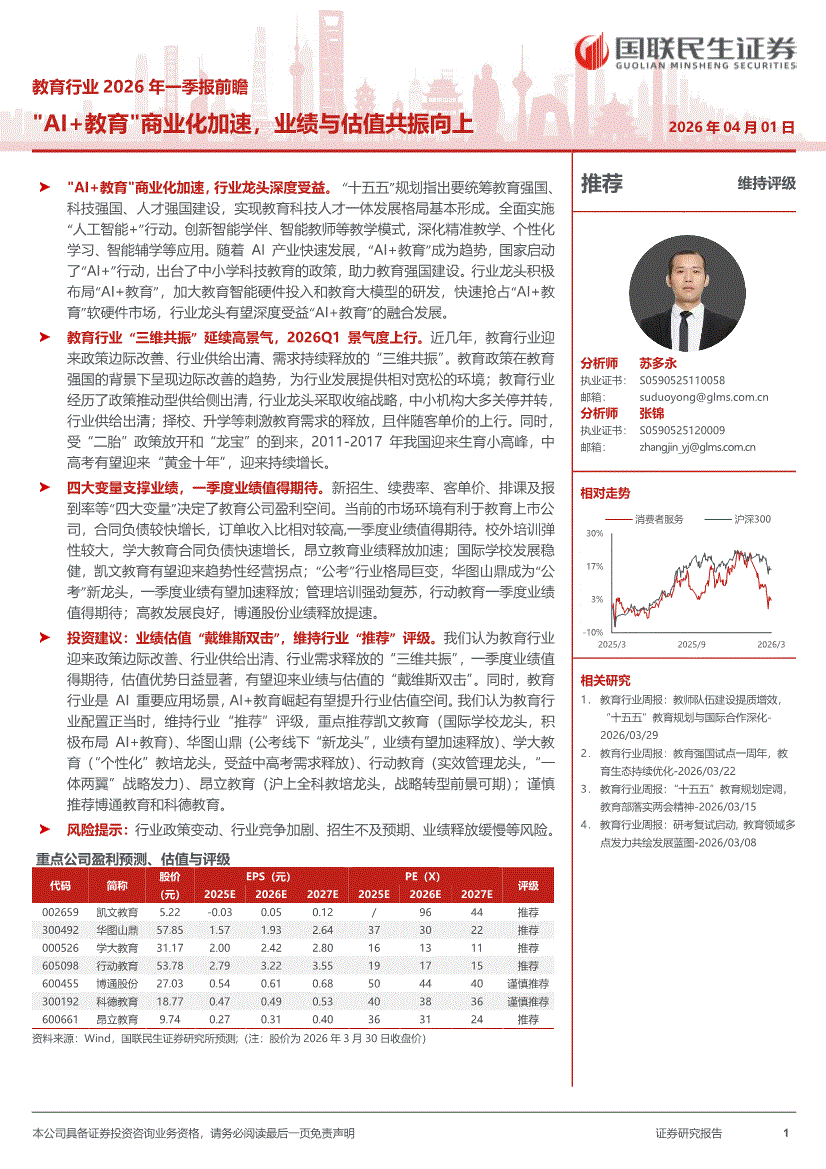 教育行业:国联民生证券-教育行业2026年一季报前瞻:“AI+教育”商业化加速,业绩与估值共振向上-260401