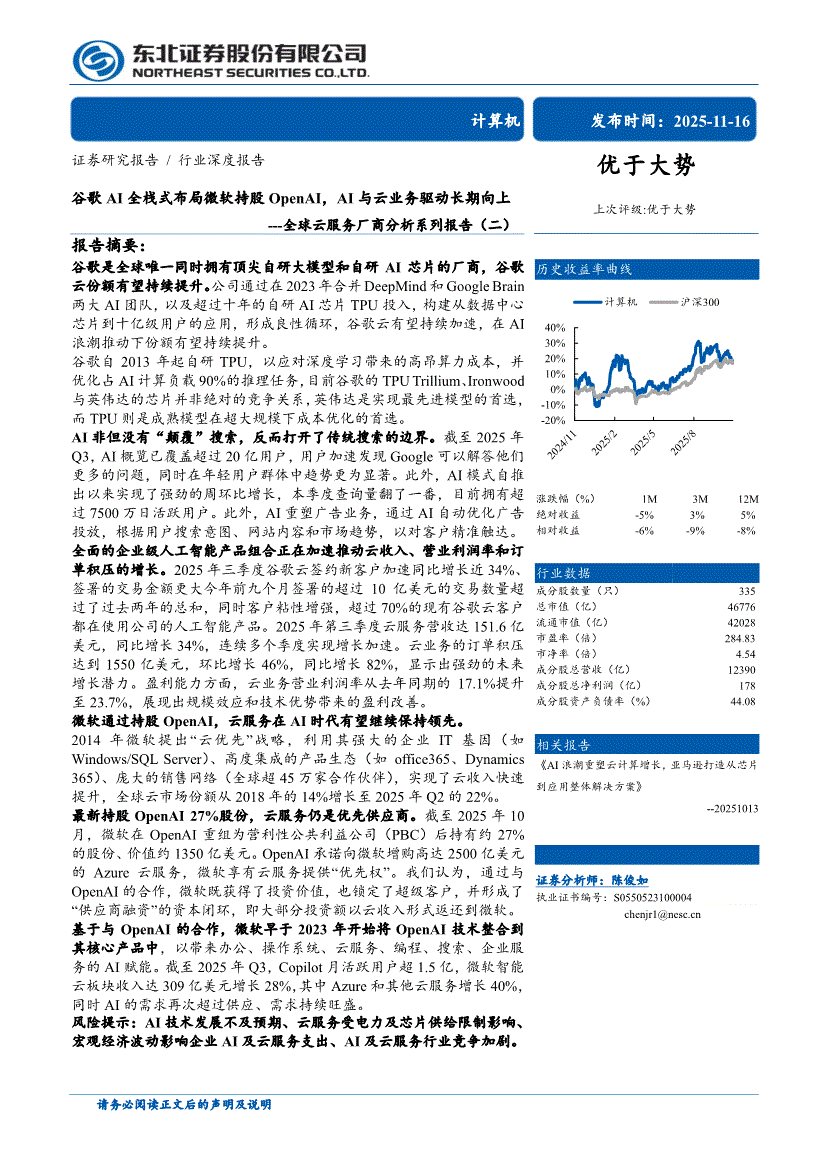 计算机行业:东北证券-计算机行业全球云服务厂商分析系列报告(二):谷歌AI全栈式布局微软持股OpenAI,AI与云业务驱动长期向上-251116