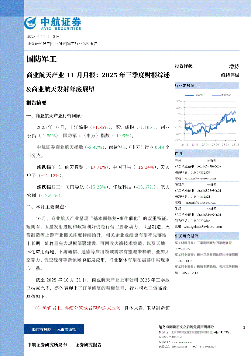 国防军工行业:中航证券-国防军工行业商业航天产业11月月报:2025年三季度财报综述&商业航天发射年底展望-251110
