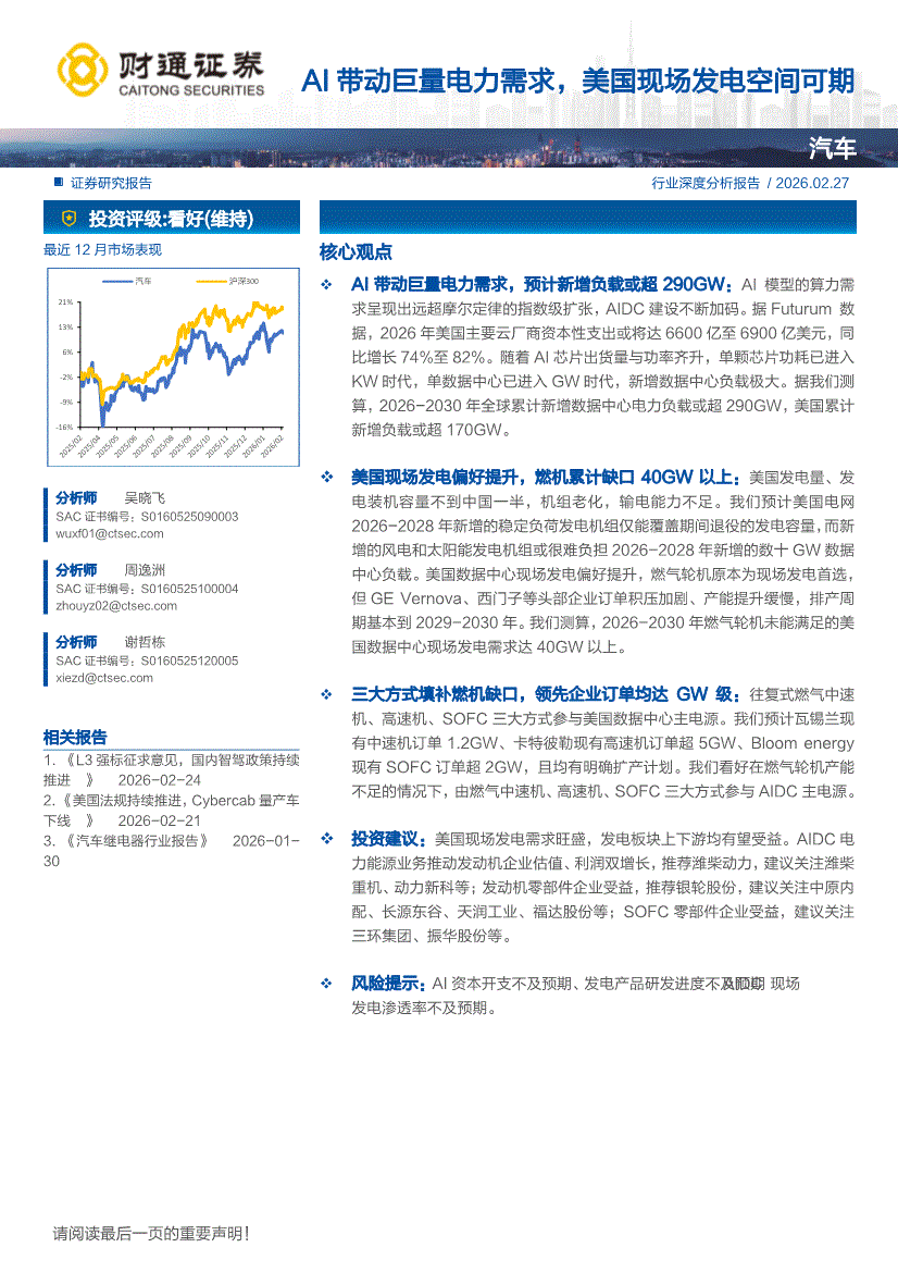 汽车行业:财通证券-汽车行业深度分析报告:AI带动巨量电力需求,美国现场发电空间可期-260227