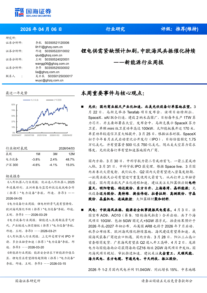 新能源行业:国海证券-新能源行业周报:锂电供需紧缺预计加剧,中欧海风共振催化持续-260406
