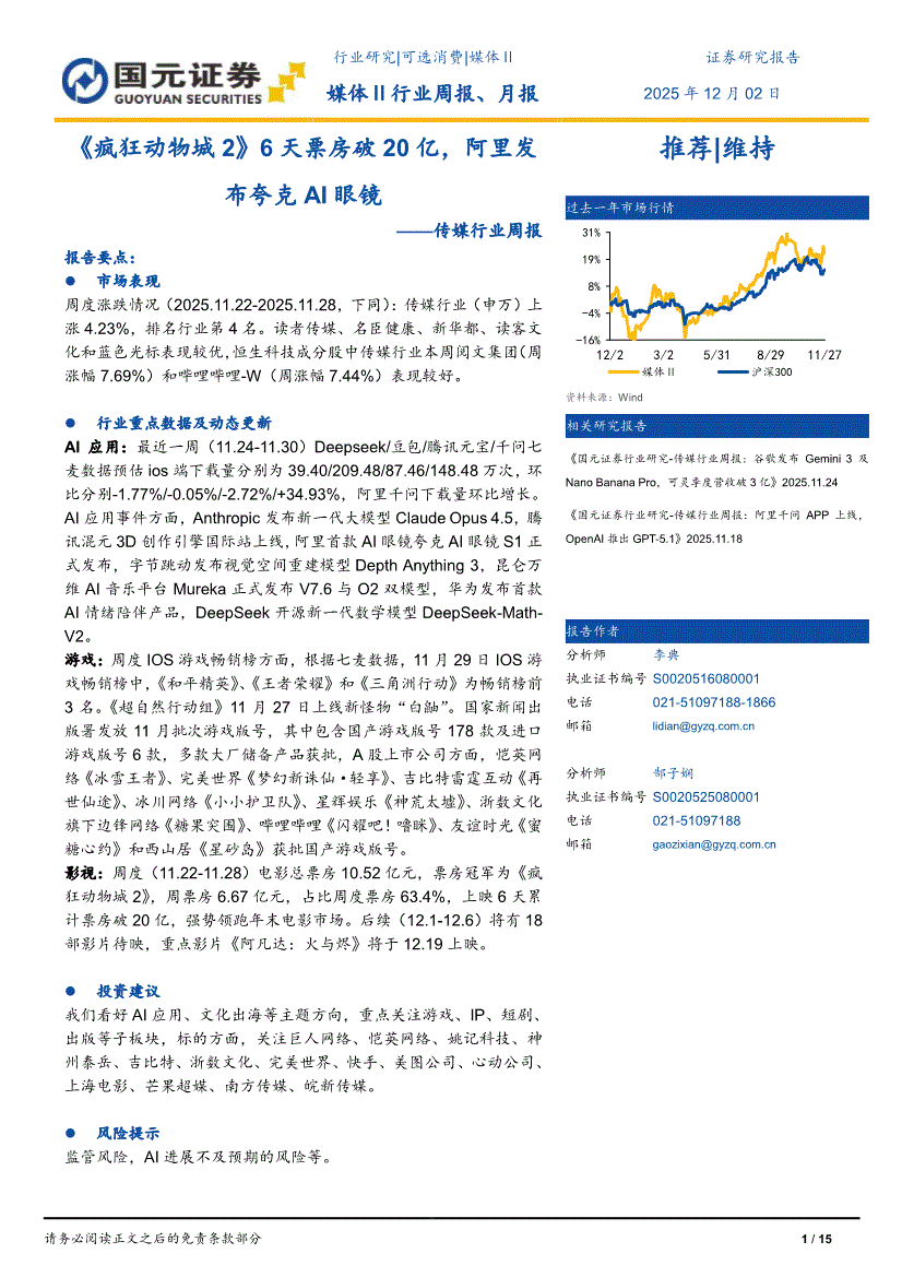 传媒行业:国元证券-传媒行业周报:《疯狂动物城2》6天票房破20亿,阿里发布夸克AI眼镜-251202
