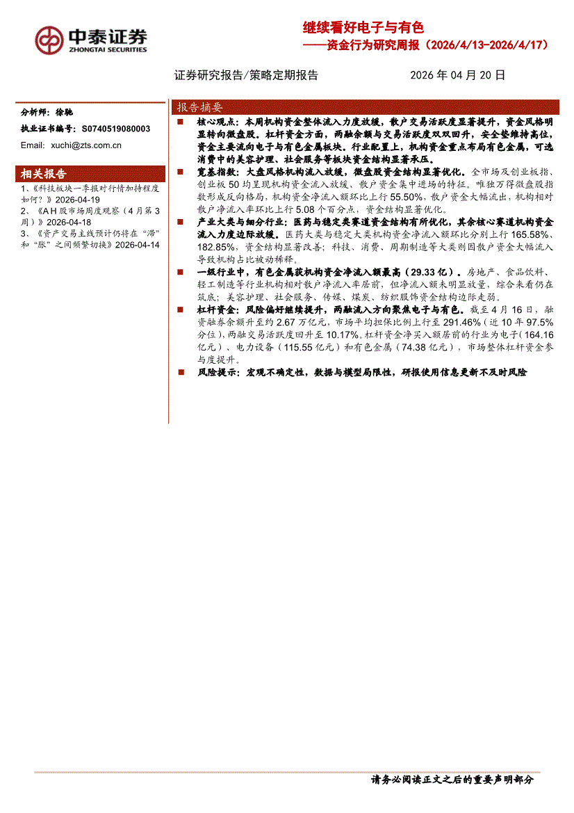 中泰证券-资金行为研究周报:继续看好电子与有色-260420