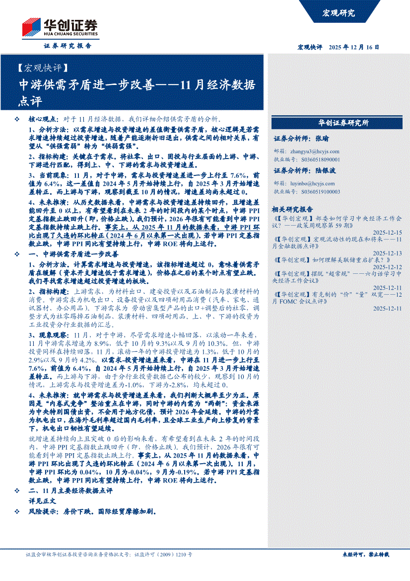 华创证券-【宏观快评】11月经济数据点评:中游供需矛盾进一步改善-251216
