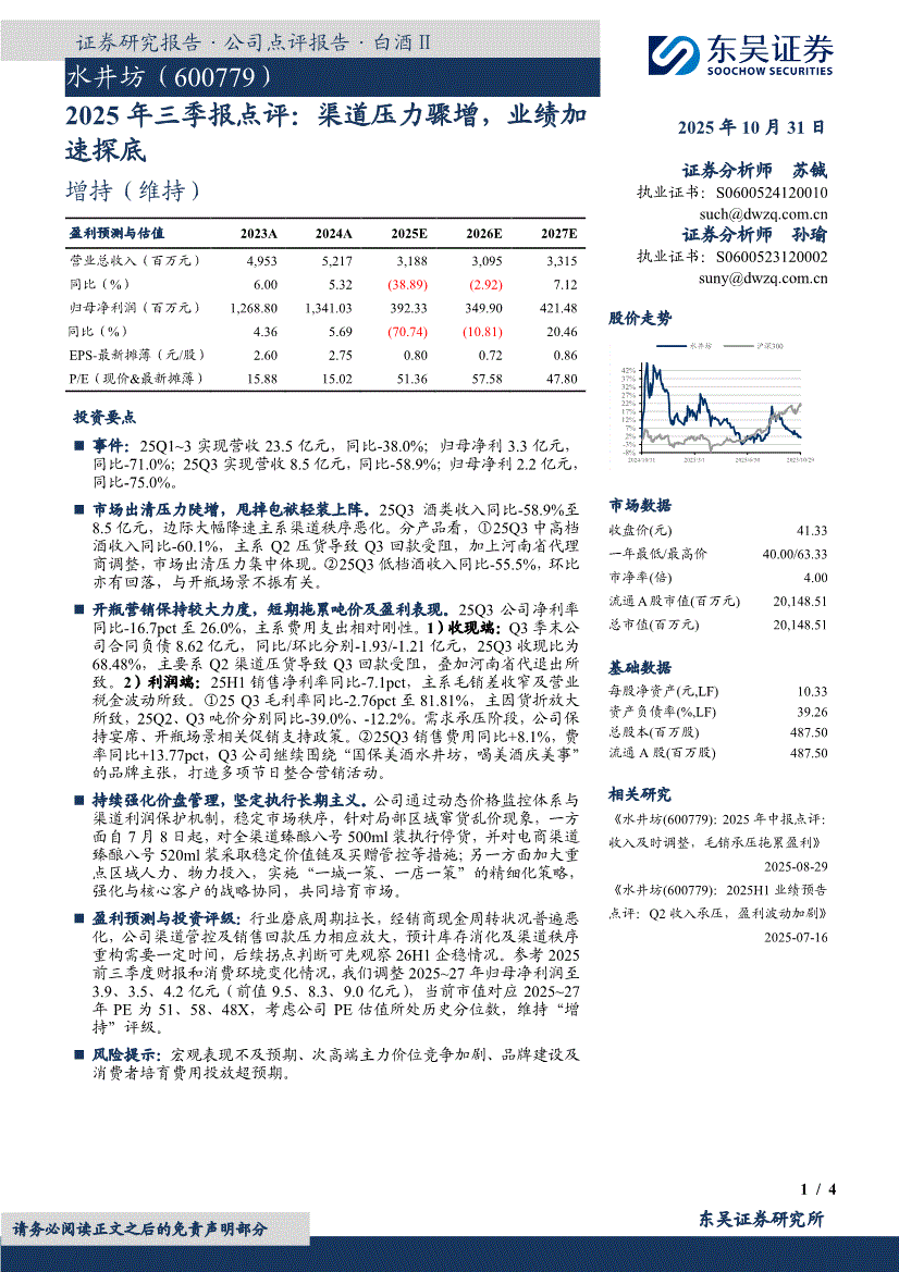 水井坊:东吴证券-水井坊-600779-2025年三季报点评:渠道压力骤增,业绩加速探底-251031
