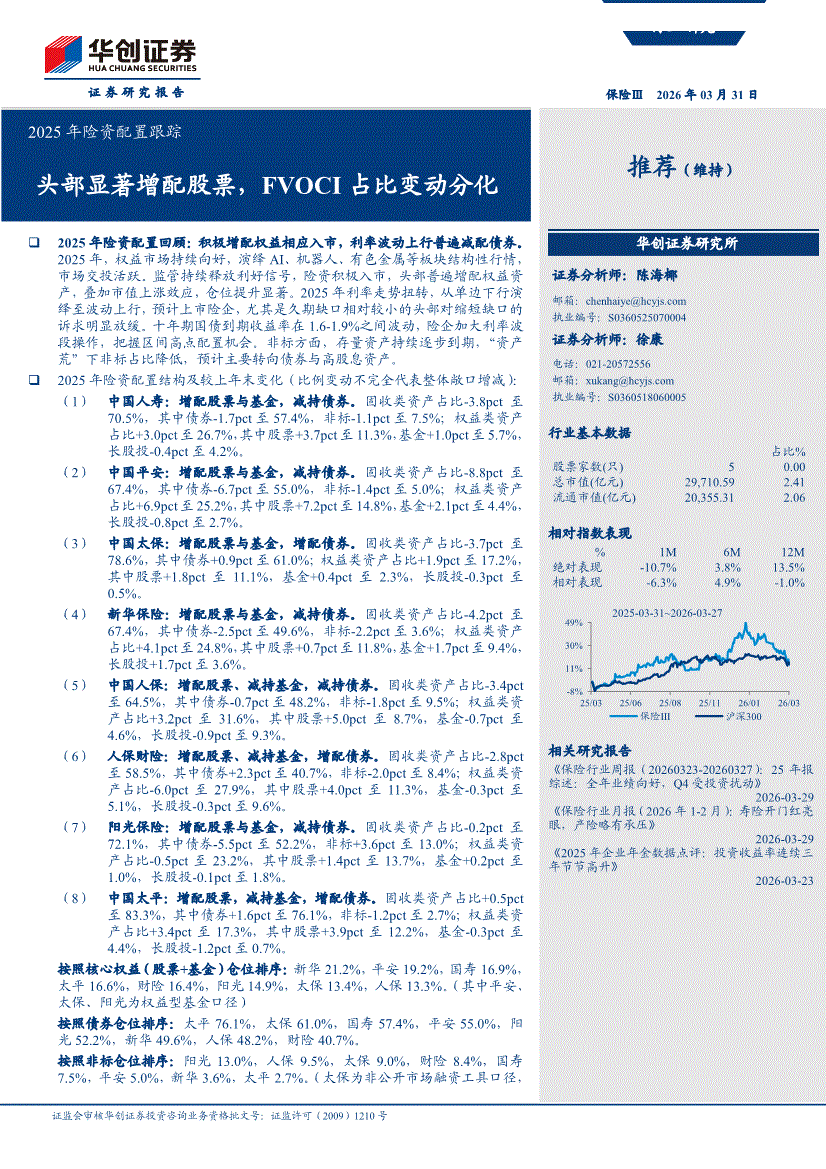 保险行业:华创证券-保险行业2025年险资配置跟踪:头部显著增配股票,FVOCI占比变动分化-260331