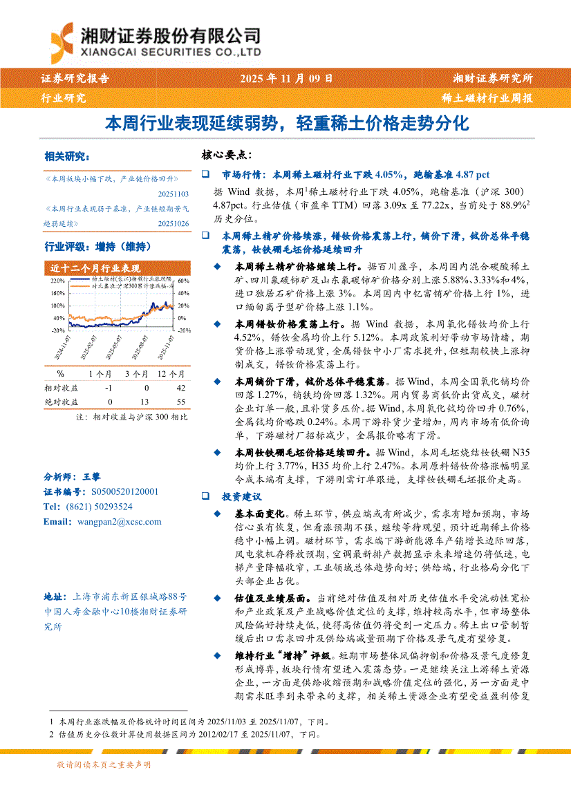 稀土磁材行业:湘财证券-稀土磁材行业周报:本周行业表现延续弱势,轻重稀土价格走势分化-251109