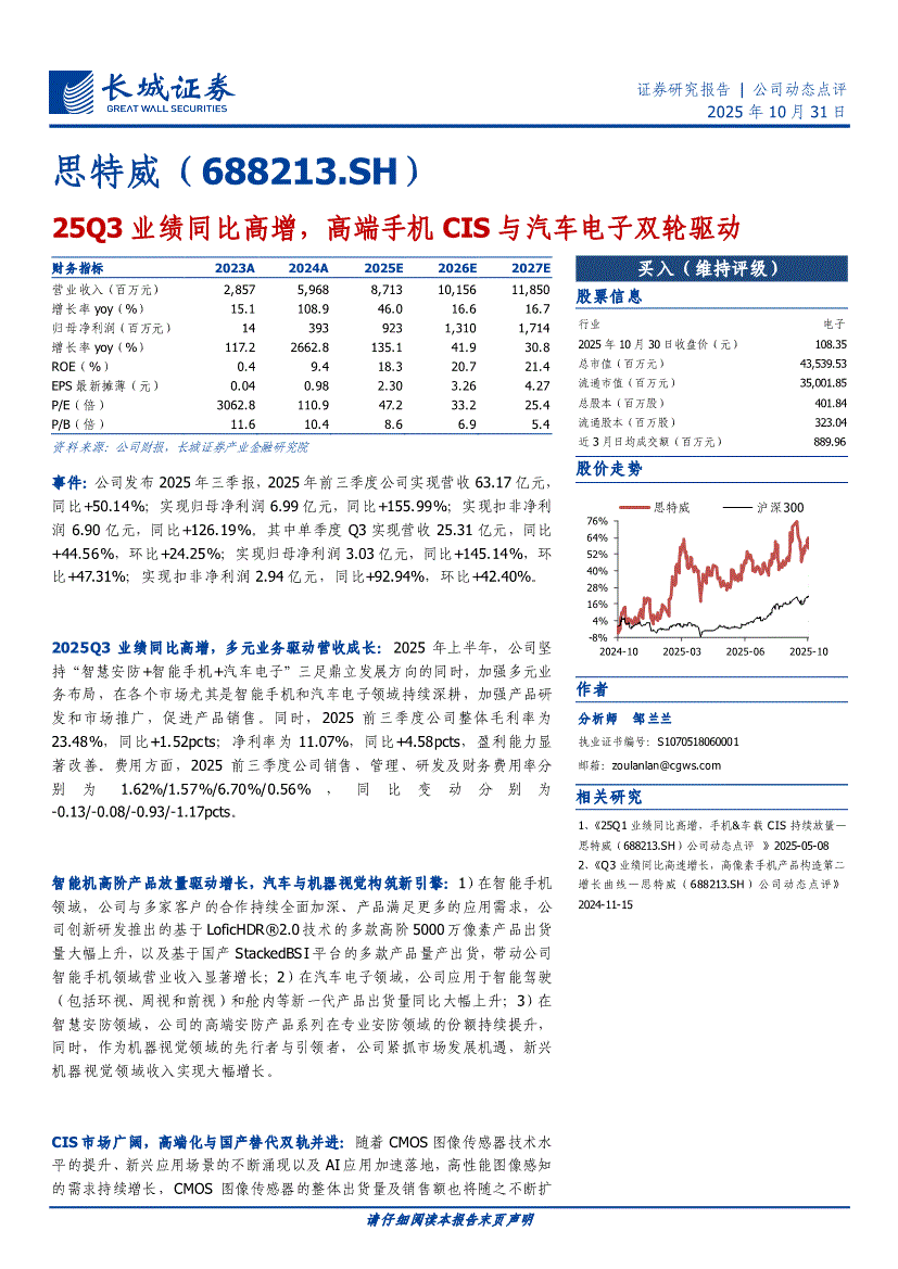 思特威:长城证券-思特威-688213-25Q3业绩同比高增,高端手机CIS与汽车电子双轮驱动-251031