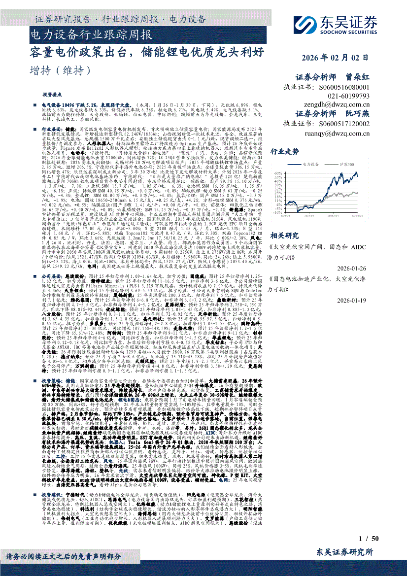 电力设备行业:东吴证券-电力设备行业跟踪周报:容量电价政策出台,储能锂电优质龙头利好-260202