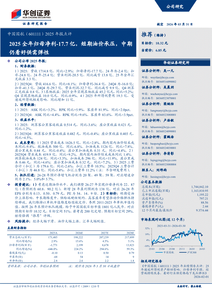 中国国航:华创证券-中国国航-601111-2025年报点评:2025全年归母净利~17.7亿,短期油价承压,中期仍看好供需弹性-260331
