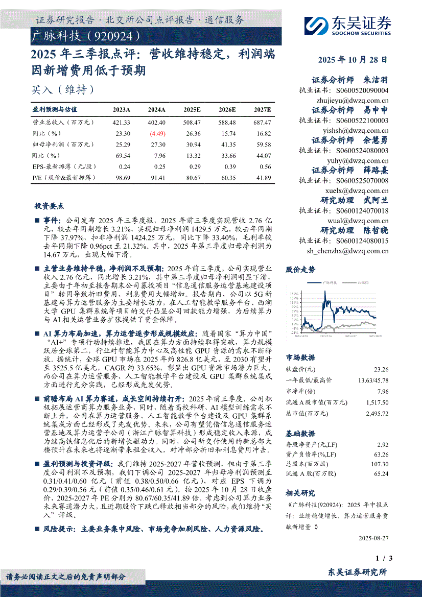 广脉科技:东吴证券-广脉科技-920924-2025年三季报点评:营收维持稳定,利润端因新增费用低于预期-251028