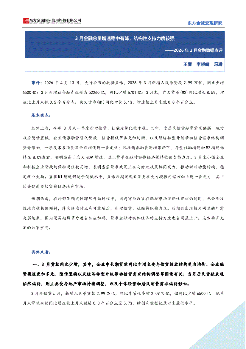 东方金诚-2026年3月金融数据点评:3月金融总量增速稳中有降,结构性支持力度较强-260414