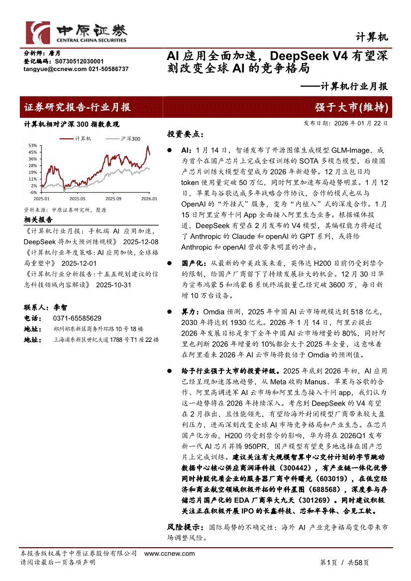 计算机行业:中原证券-计算机行业月报:AI应用全面加速,DeepSeek V4有望深刻改变全球AI的竞争格局-260122