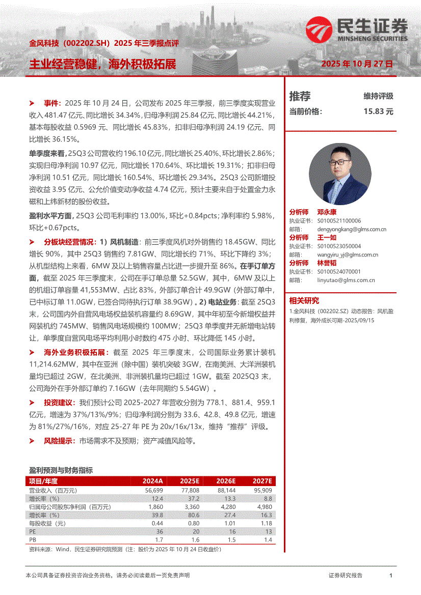 金风科技:民生证券-金风科技-002202-2025年三季报点评:主业经营稳健,海外积极拓展-251027