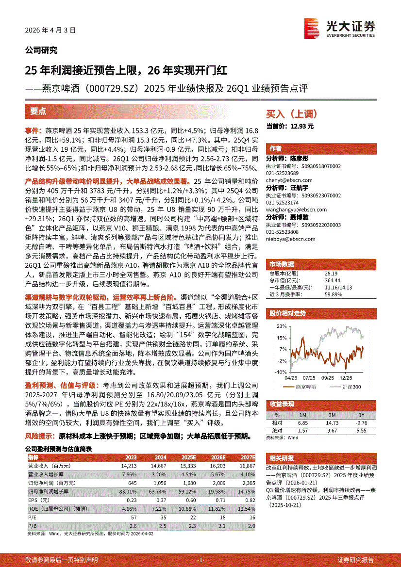 燕京啤酒:光大证券-燕京啤酒-000729-2025年业绩快报及26Q1业绩预告点评:25年利润接近预告上限,26年实现开门红-260403